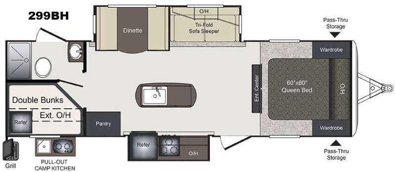 There is a exterior pass-through storage compartment for your outdoor camping gear. This unit also features an exterior kitchen with a pull-out sink and two burner stove top, grill, refrigerator, and overhead cabinet space, plus so much more!