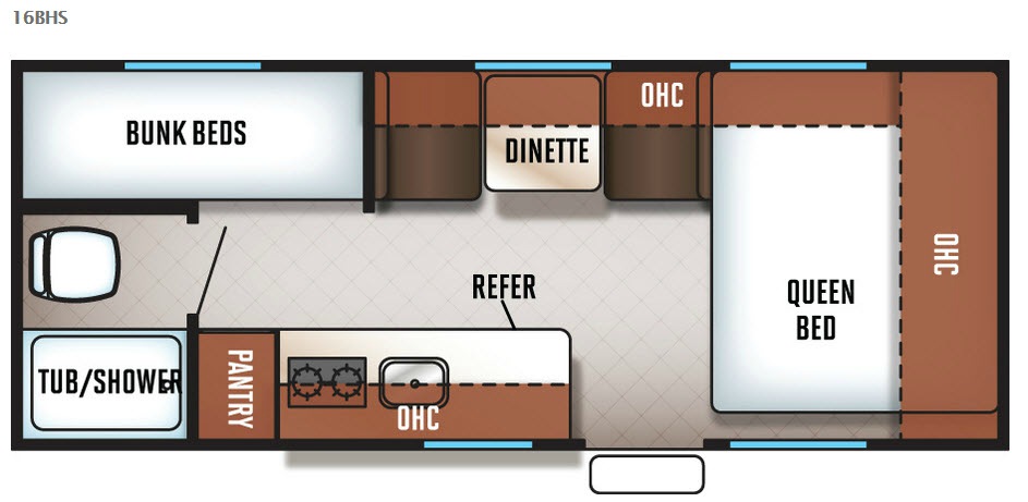 The very back left corner features a private tub/shower and toilet area. Right next door there is a set of bunks that the kids will enjoy sleeping on, plus so much more!