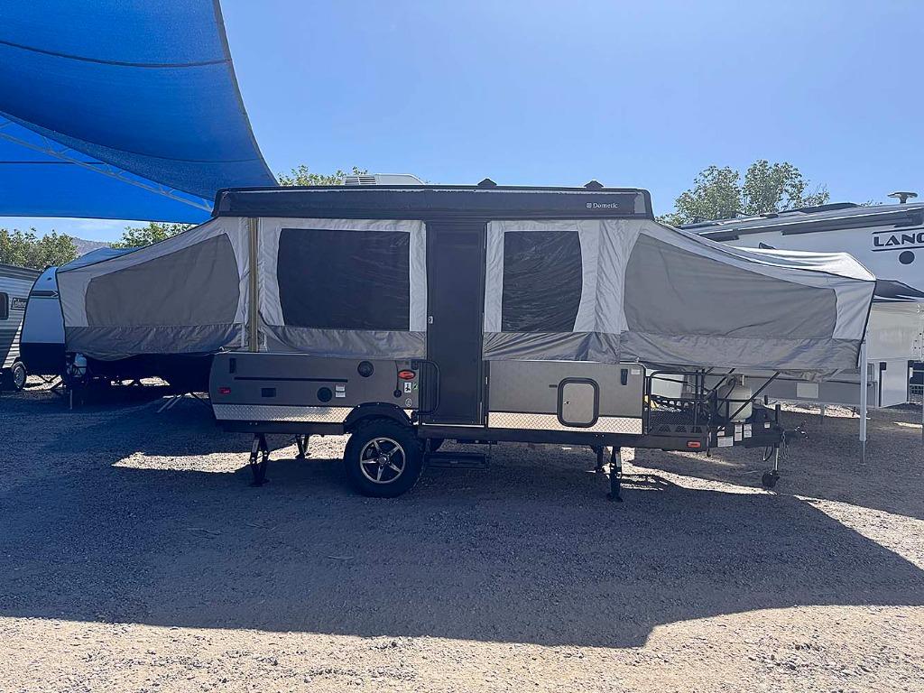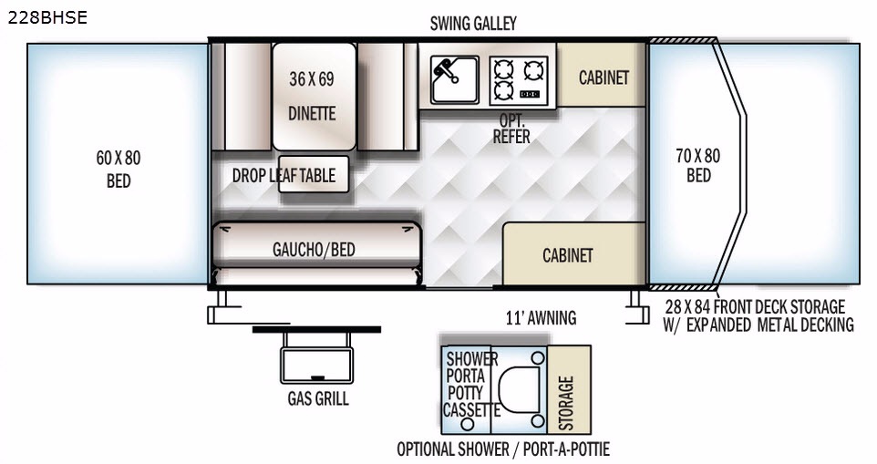 Along the curb side wall to the left of the entry is a gaucho/bed. The opposite side of the camper offers a dinette and table extension where you can gather around and enjoy your meal or maybe a game or two. Meal prep and clean up is a breeze with the swing galley, sink, three burner range, cabinet, and optional refrigerator. Another cabinet for storage is beside the front tent end bed, or you can choose and optional shower cassette and port-a-pottie.