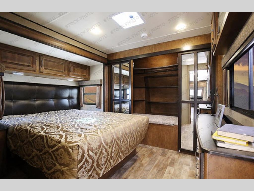 The front bedroom will provide you with a great night's rest. Here you will find a queen or optional king size slide out bed with nightstands and overhead storage, a dresser, TV prepped space, and a full front wardrobe with washer/dryer prep.