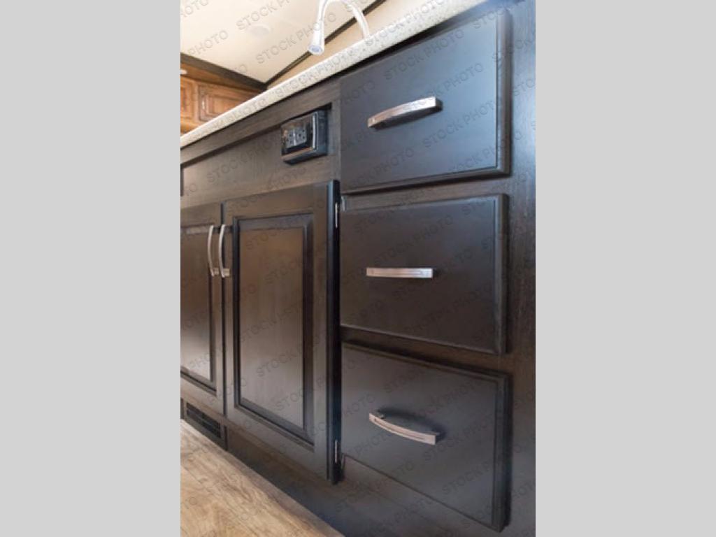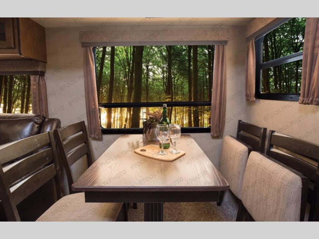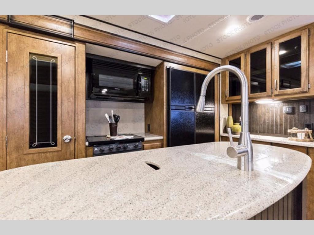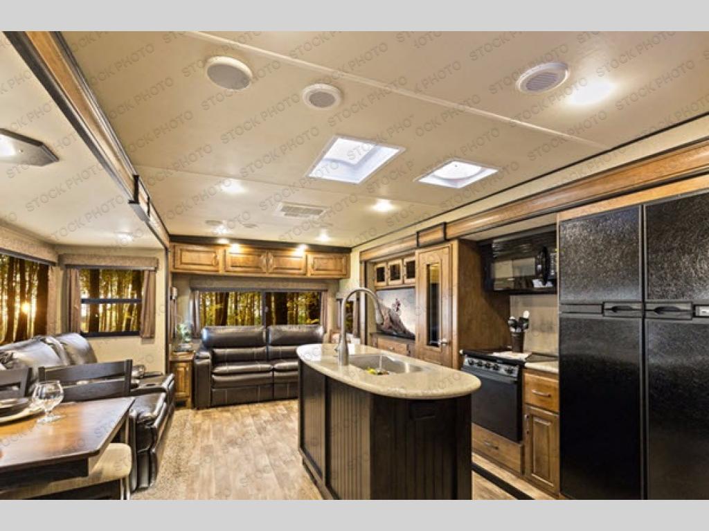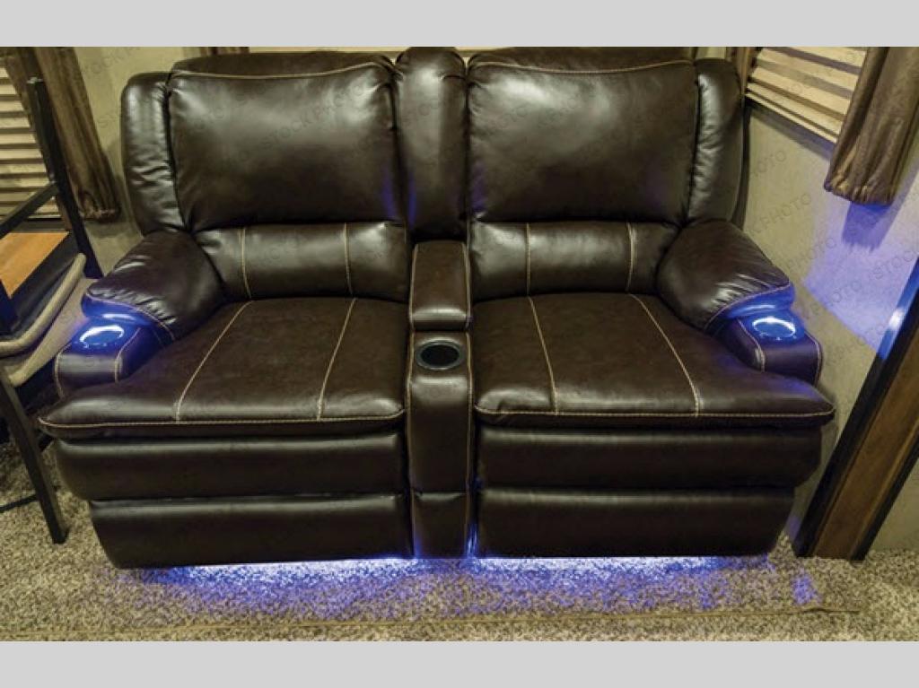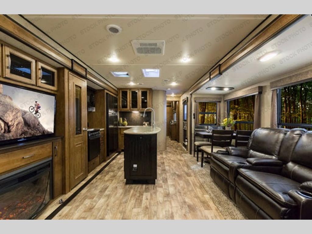 As you enter you will find a combined kitchen and living room with dual opposing slides. The slide to your left features a dinette (with free standing table and chairs option shown), and theater seats for two including cup holders. Along the rear wall adjacent to the theater seats you will find a tri-fold sofa with storage overhead for plenty of seating and added sleeping space for overnight guests. A nearby entertainment center with a 40" TV and fireplace are found in the slide along the road side that also contains the kitchen appliances.