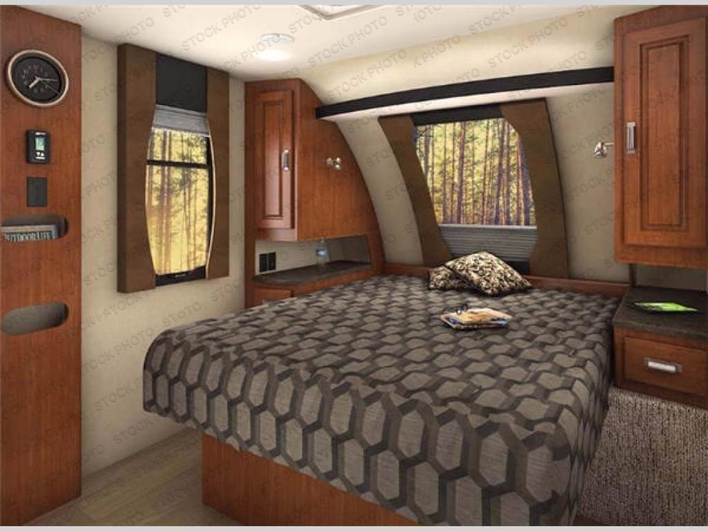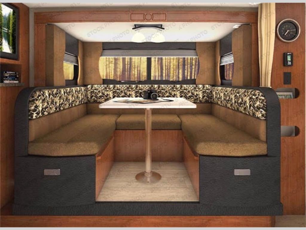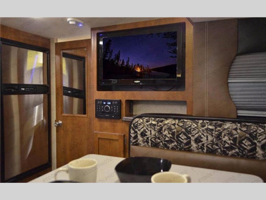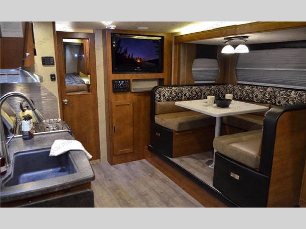 There is a large slide out u-shaped dinette which will easily seat everyone comfortably. An entertainment center has been placed so that it faces the entire living space so no matter where you are at, in the large u-shaped dinette slide, laying in bed, or on the sofa bed if you chose it, you would have a great spot to enjoy the optional TV.