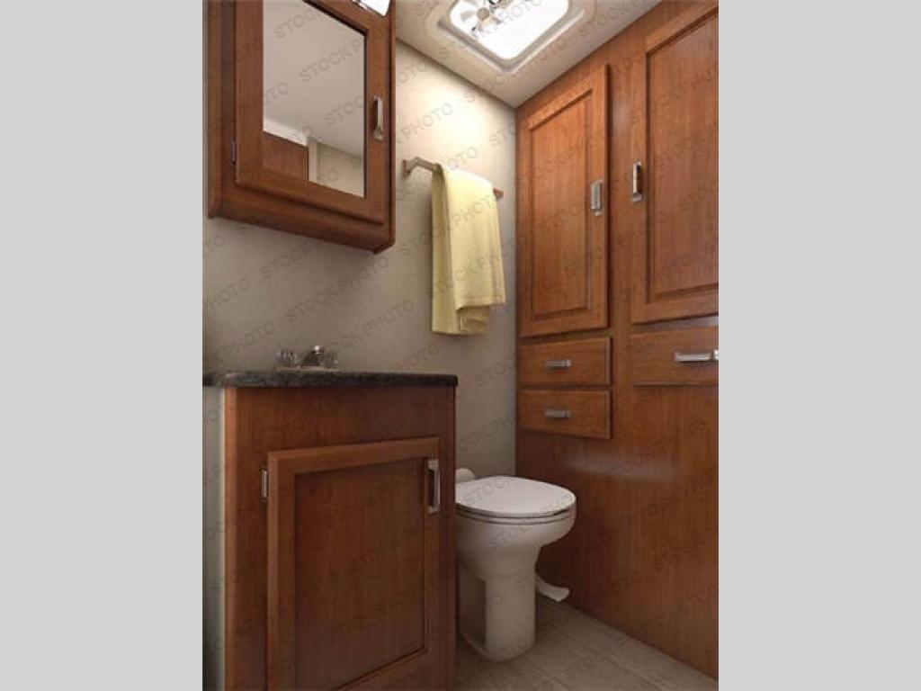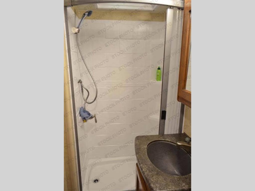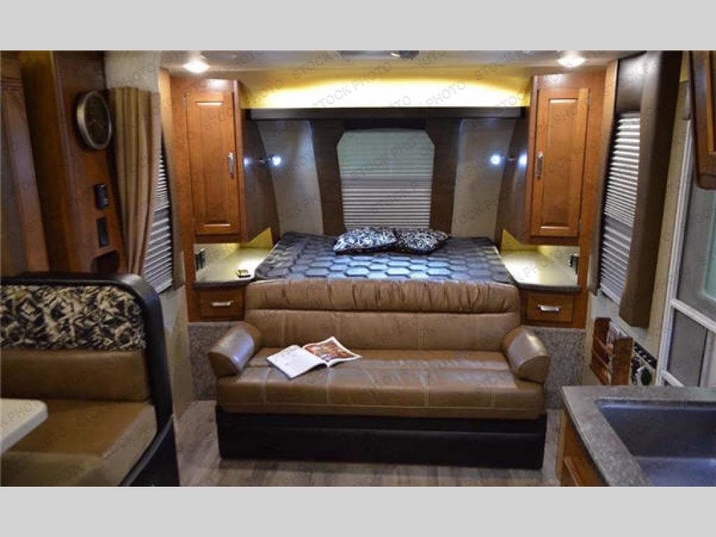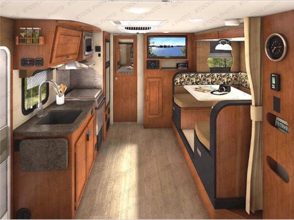 There is a large slide out u-shaped dinette which will easily seat everyone comfortably. An entertainment center has been placed so that it faces the entire living space so no matter where you are at, in the large u-shaped dinette slide, laying in bed, or on the sofa bed if you chose it, you would have a great spot to enjoy the optional TV.