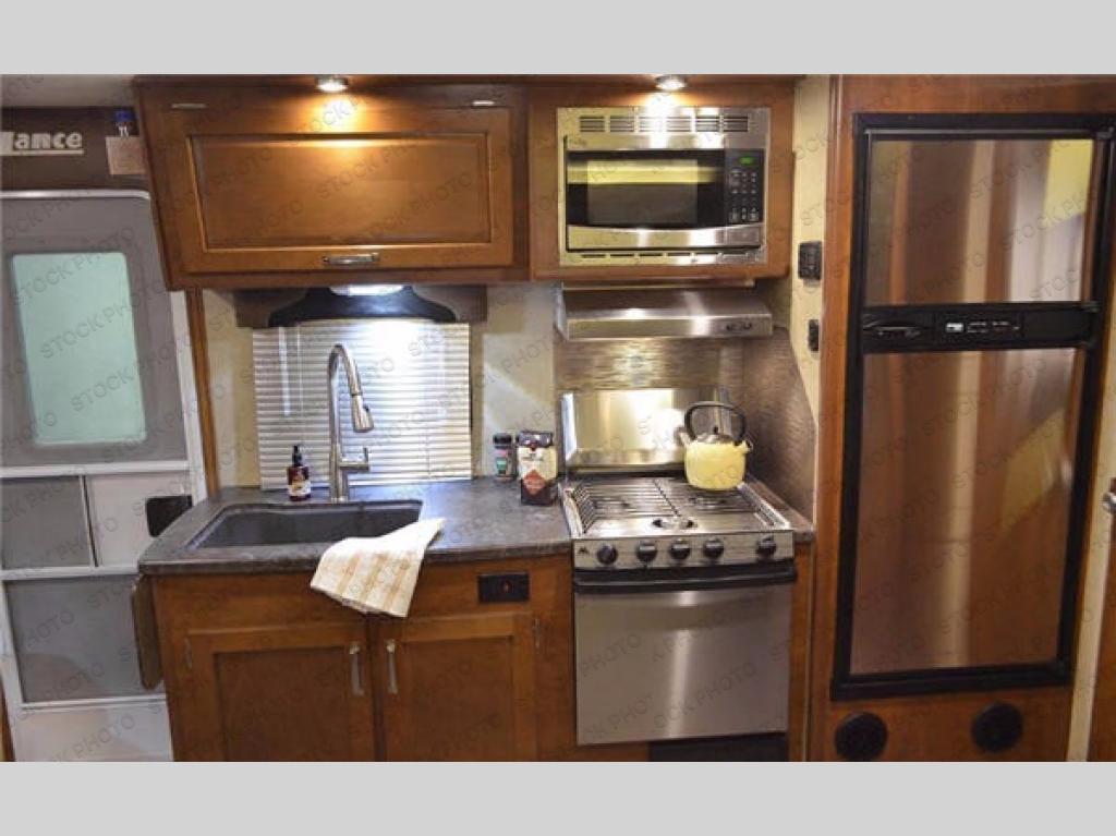 In the kitchen area you will find a single galley sink, a three burner range, and refrigerator. There are also overhead cabinets for storage, plus a flip-up counter extension.