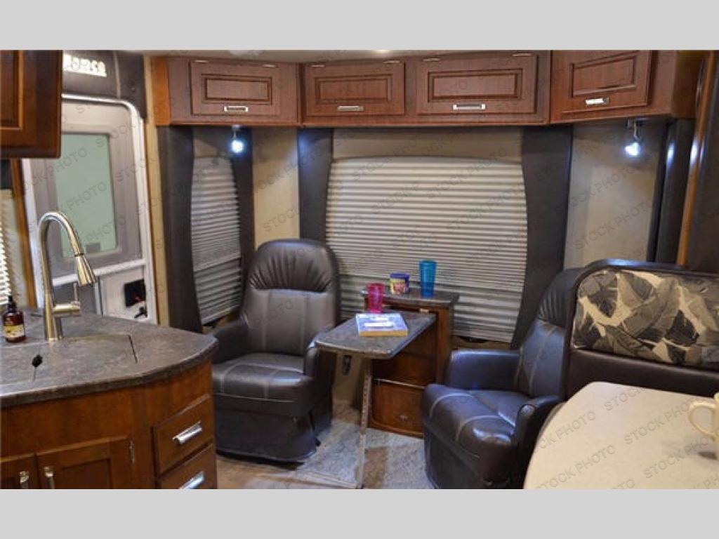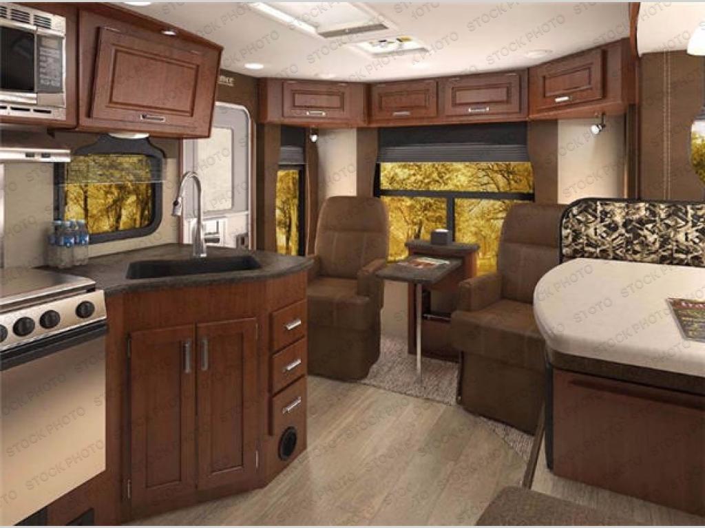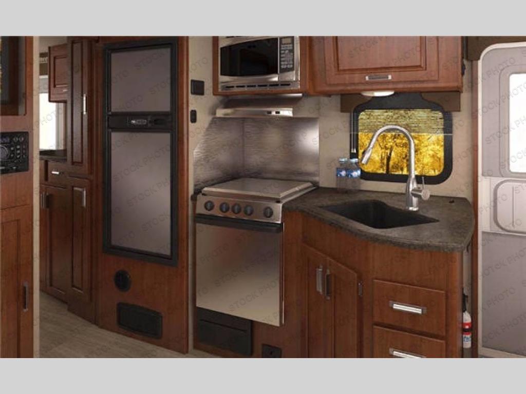 A slide out dinette offers space for dining, and the slide creates a larger foot traffic space for moving about. The galley is opposite and features a large sink, a three burner range, and a refrigerator for your perishables. Overhead storage allows you to keep your daily dishes and food items handy.