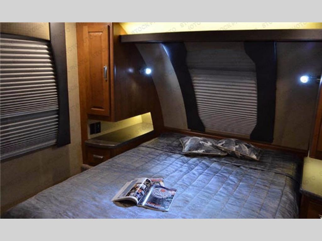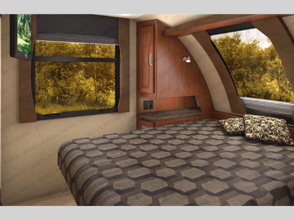 The very front of this Lance camper features a queen size bed plus dual bedside shirt closets and nightstands. There is also a space for an optional TV.