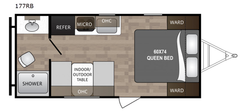 Imagine camping with your spouse at your favorite state park. You will probably enjoy making meals with the kitchen appliances, dining at the dinette, and taking the indoor/outdoor table outside to play a game under the power awning. You can get cleaned up in the shower and brush your teeth before bedtime to retire to your own queen bed in the front of this unit. You even have dual wardrobes on either side of the bed for your belongings.