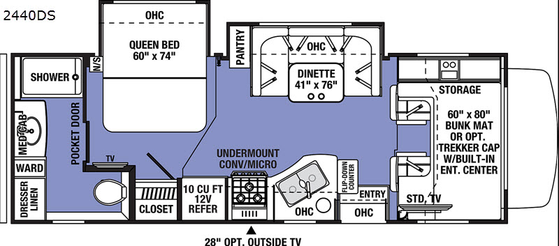 Don't miss out on fun summer vacations when you can turn every trip into a road trip with this Sunseeker! The two slides open up the interior and allow six people to travel, sleep and move around easily. The shower head with flexible extension and skylight in the large rear bathroom allows everyone to comfortably shower and get ready each morning. The convection microwave in the kitchen will give you the perfect excuse to whip up breakfast as you plan out your day of adventures while seated at the U-shaped dinette.