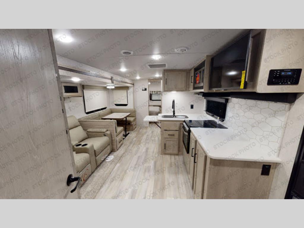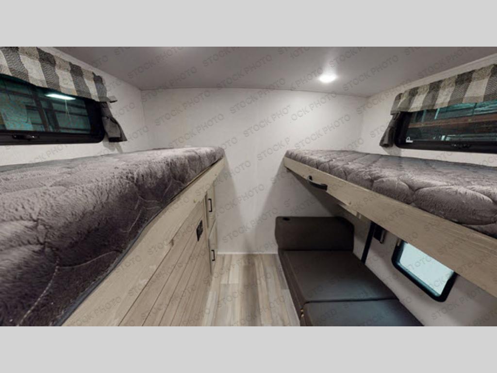The kids are ready, are you? The kids can use the main entry to load their items in the private bunkhouse which includes two bunks and a Play-Cube sofa for those rainy days inside. You can use the master bedroom's exterior entry to load your clothing in the wardrobe and the front storage area with countertop for more items and even some picture frames once at your destination. You will also find a slide out queen bed. The main living and kitchen area includes a slide out with a 44" x 81" U-shaped dinette and 60" hide-a-bed sofa offering more floor space to do yoga, play Twister, or even stretch your legs out from the furniture. The cook will love the L-shaped counter space and countertop extension when washing the dishes. The outside kitchen will come in handy for outdoor cooking while visiting with everyone hanging out around the campfire.
