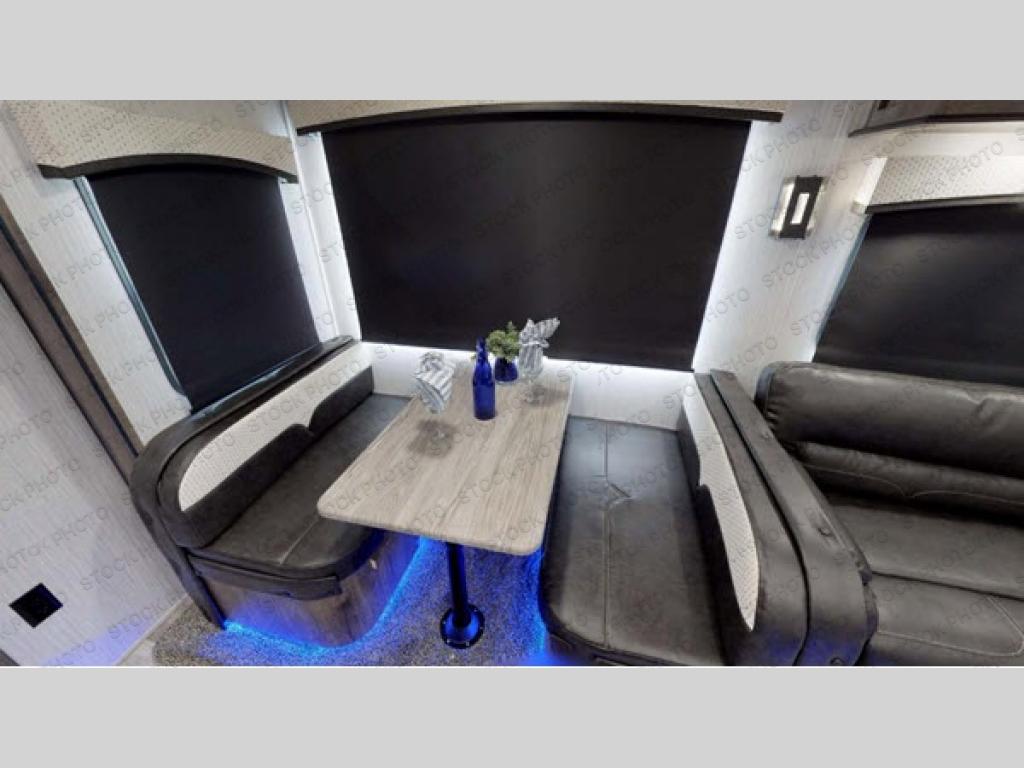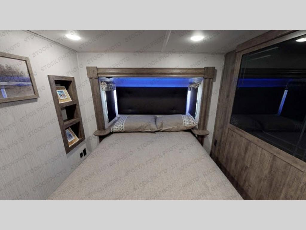 A spacious living and kitchen area allows the whole family to gather for meals at the booth dinette, the tri-fold hide-a-bed sofa and theater seating as well as at the kitchen island to enjoy dining together. Everyone can also find their camping chairs from the drop frame pass-through compartment and place them under the 15' electric awning to dine outdoors. The cook may make several meals using the exterior kitchen and the full amenities inside from the four-burner cooktop to the 20 cu. ft. refrigerator. The half bathroom offers an interior and exterior entry for maximum convenience, and is within the private bunkhouse which includes two bunks, a glide sofa and two floor to ceiling wardrobes. And the master bedroom gives you your own queen bed, a large front wall wardrobe and the full bathroom is only a few steps down the hallway.