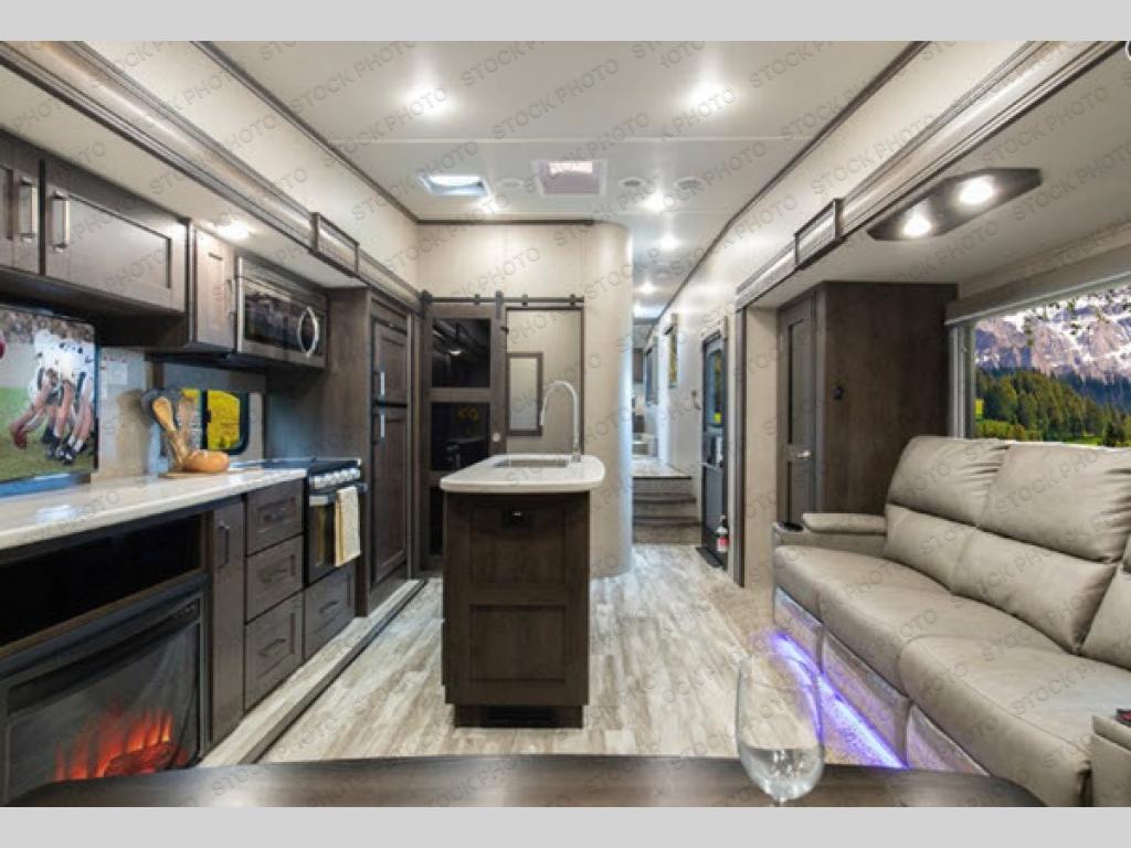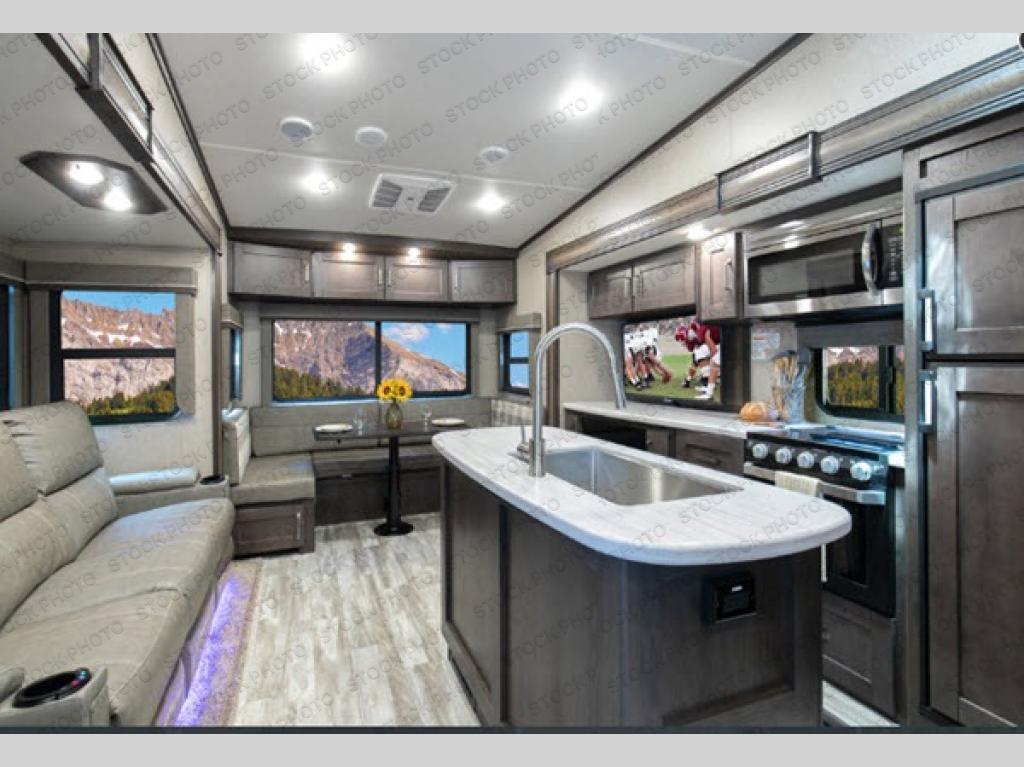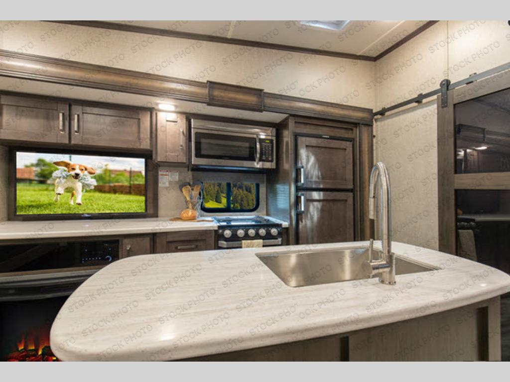 Everyone will have a good time in this fifth wheel! There is a front private bedroom with a queen bed for two to enjoy a good night's rest, and a second bedroom with a 36" flip top bunk above a 44" bottom bunk and a dresser with overhead cabinets. There is a kitchen island with a deep, seated stainless steel sink with a high rise faucet and a pull down sprayer to make cleaning up easier. The rear 92" U-shaped lounge is big enough for everyone to gather around at meals, and the 78" theater seating is across from the entertainment center with a 40" HDTV and fireplace below it!