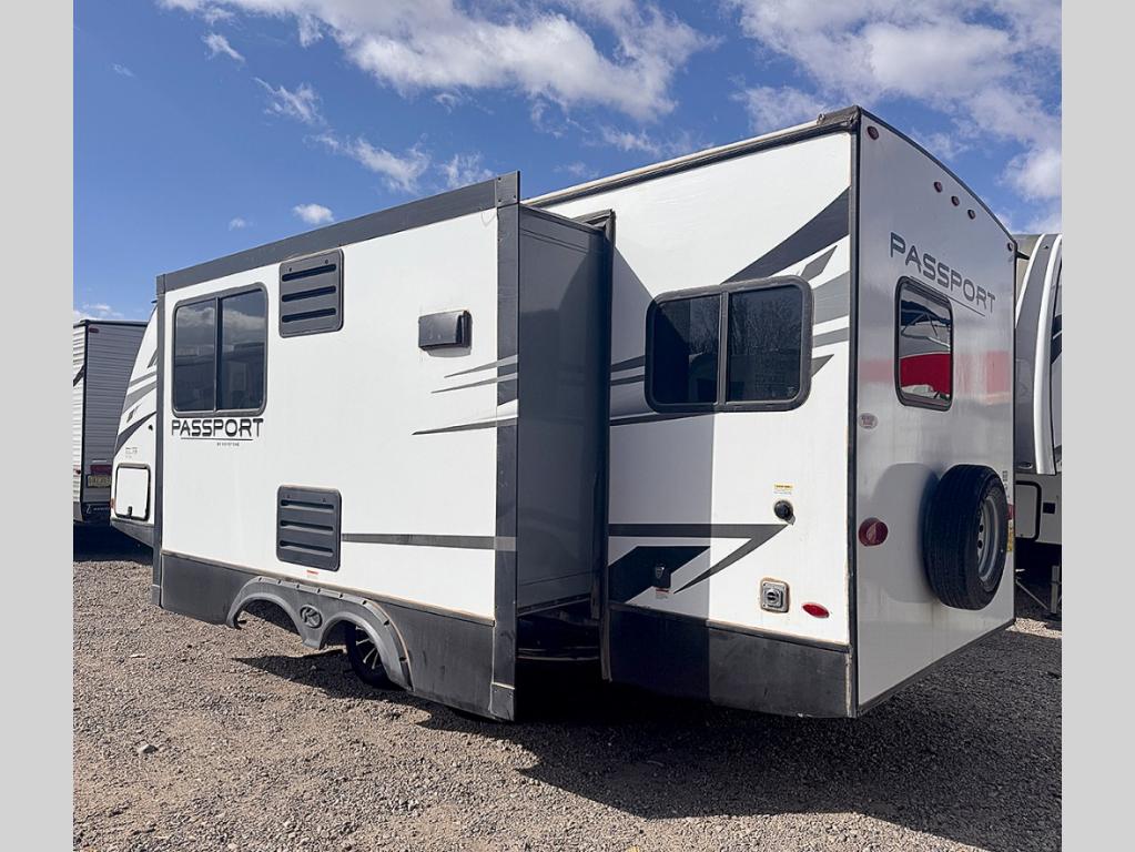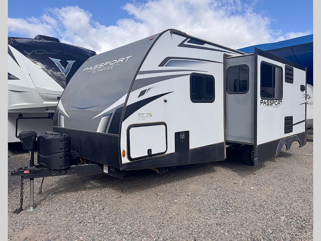 You can take many different kinds of trips with this Passport SL travel trailer! Once you get to the campsite and set up the 19' awning, you can remove your travel gear from the exterior pass-through storage to create your own little retreat. On the interior, the front private bedroom provides you with a queen-size bed, nightstands, and bedside wardrobes so that you can easily get changed every morning and night. The large slide out in the main living area will add to the amount of living space on the interior without adding to the overall width of the trailer. As the night comes to a close, you can heat up a bag of popcorn in the microwave before sitting down in the theater seating which could be switched out for the optional tri-fold sofa sleeper.