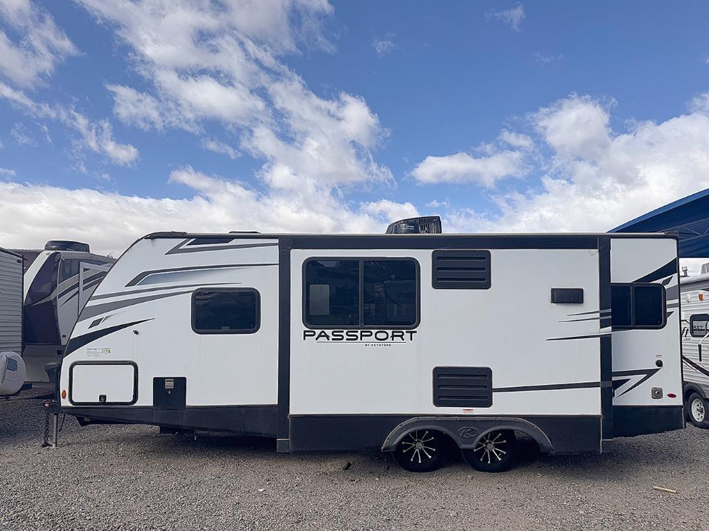 The Passport SL travel trailers by Keystone RV come in a compact design with travel-friendly lengths that are lightweight and easy to tow behind many smaller crossover SUVs. You will find several residential-style features such as durable Armstrong vinyl flooring, upgraded window treatments and valances, and bathroom countertops. The exterior shower with hot and cold water is very useful as you get cleaned up before entering the RV, wash your pets, or even rinse a few dishes outside. The Passport also now contains a HyperDeck flooring system which is a high-performance, water-resistant RV floor that comes as a breakthrough design from the Keystone Innovation Lab. This flooring is more resilient, stronger, and lighter than traditional laminated wood construction.