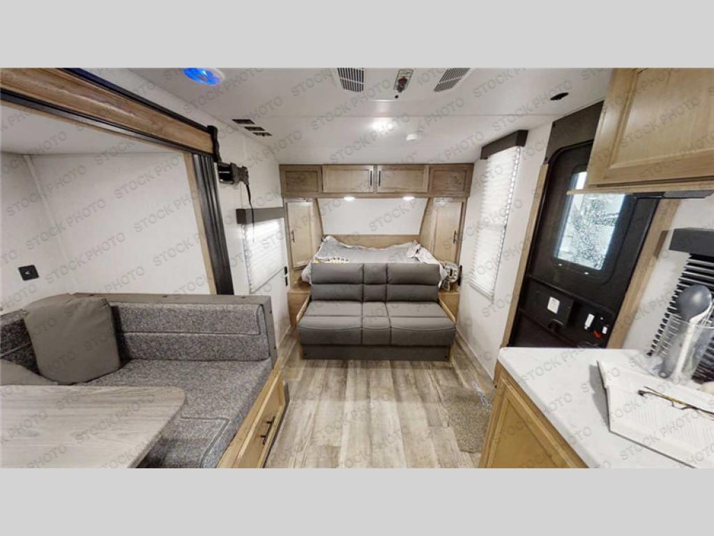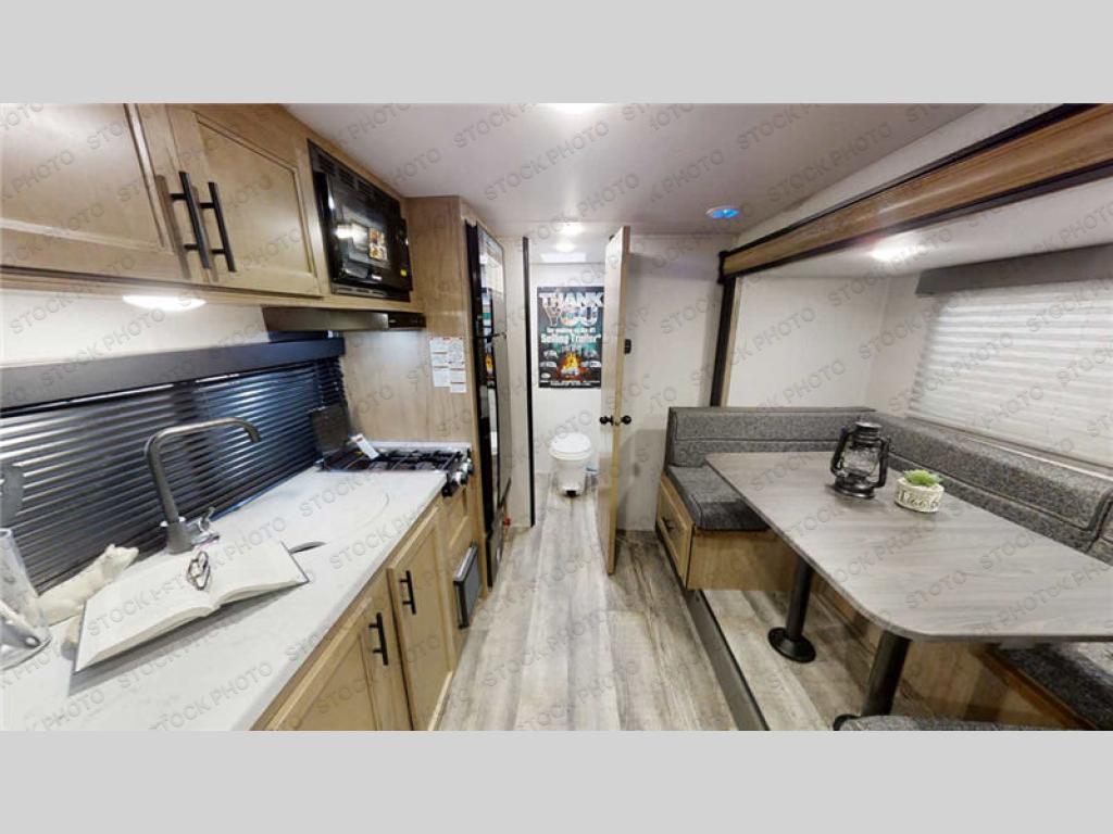 Perfect for a couple or family of four to enjoy. This Wolf Pup unit offers a versatile Cherokee Sleep System which allows you to convert a portion of your bed into a sofa for daytime use so you can have more seating when needed and not have the additional unit length that an added separate sofa would require. The U-shaped dinette offers plenty of seating for meals or games, and there are large storage drawers beneath for your things. This can also be converted into added sleeping space if needed at night. The kitchen provides a microwave oven, round single bowl sink with cover for added counter space, a range for cooking, and a 12 volt residential refrigerator to keep all of your perishables fresh. The rear bath features a tub/shower, toilet, and vanity with sink, plus medicine cabinet and skylight.