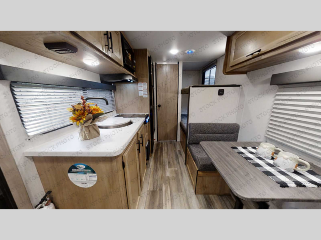 The whole family can sleep comfortably in this travel trailer! It has a set of bunk beds for the kids to sleep on, and you can sleep comfortably on the front queen bed with overhead cabinets and a shelf. There is even an exterior storage plus door that accesses the storage space under the bottom bunk. The chef will enjoy preparing their best home cooked meals either indoors with the high output cooktop or at the outside mini kitchen while staying protected by the 12' power awning!